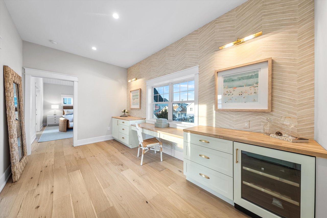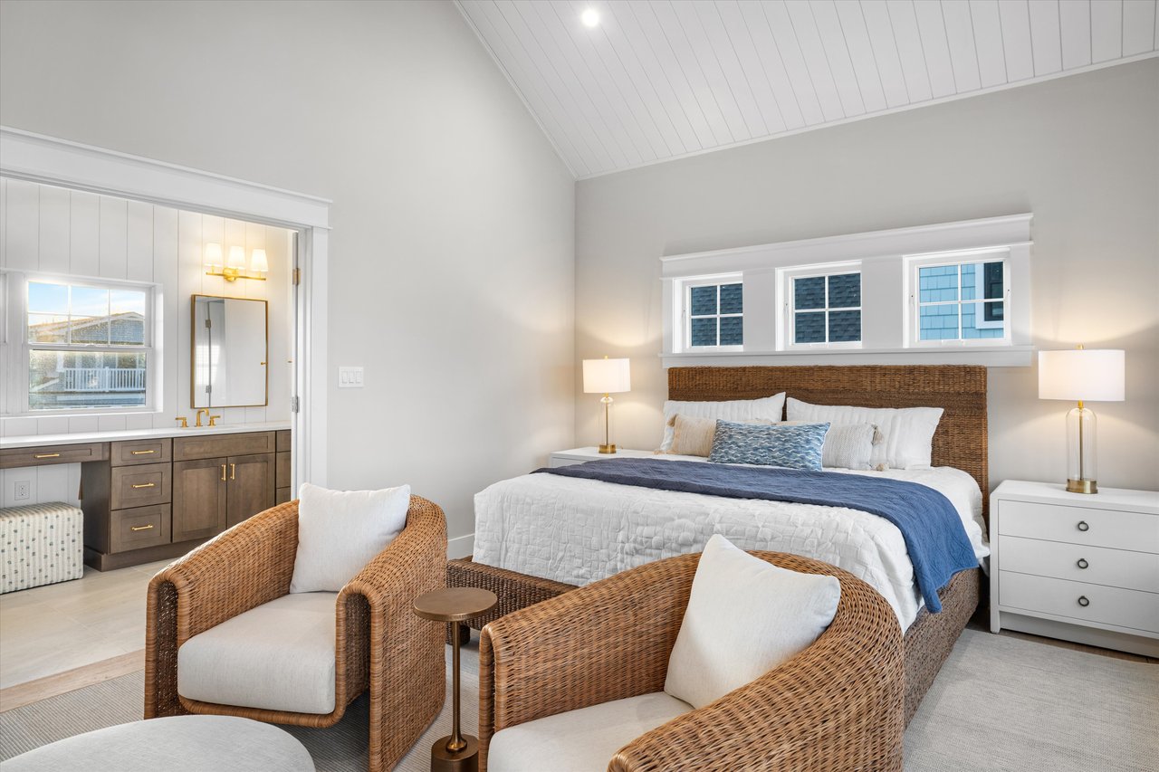 The primary suite occupies its own private wing, accessed through a pocket door that opens into a light-filled breezeway featuring a home office with custom cabinetry, under-counter refrigeration, and a large walk-in closet. The luxurious primary retreat boasts soaring ceilings with V-groove paneling and a spa-inspired bathroom complete with a vertical shiplap accent wall, dual vanities, and a stunning walk-in shower.