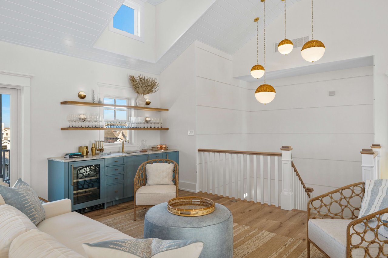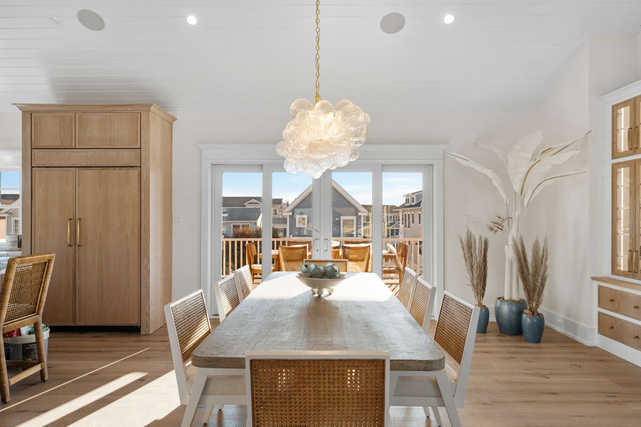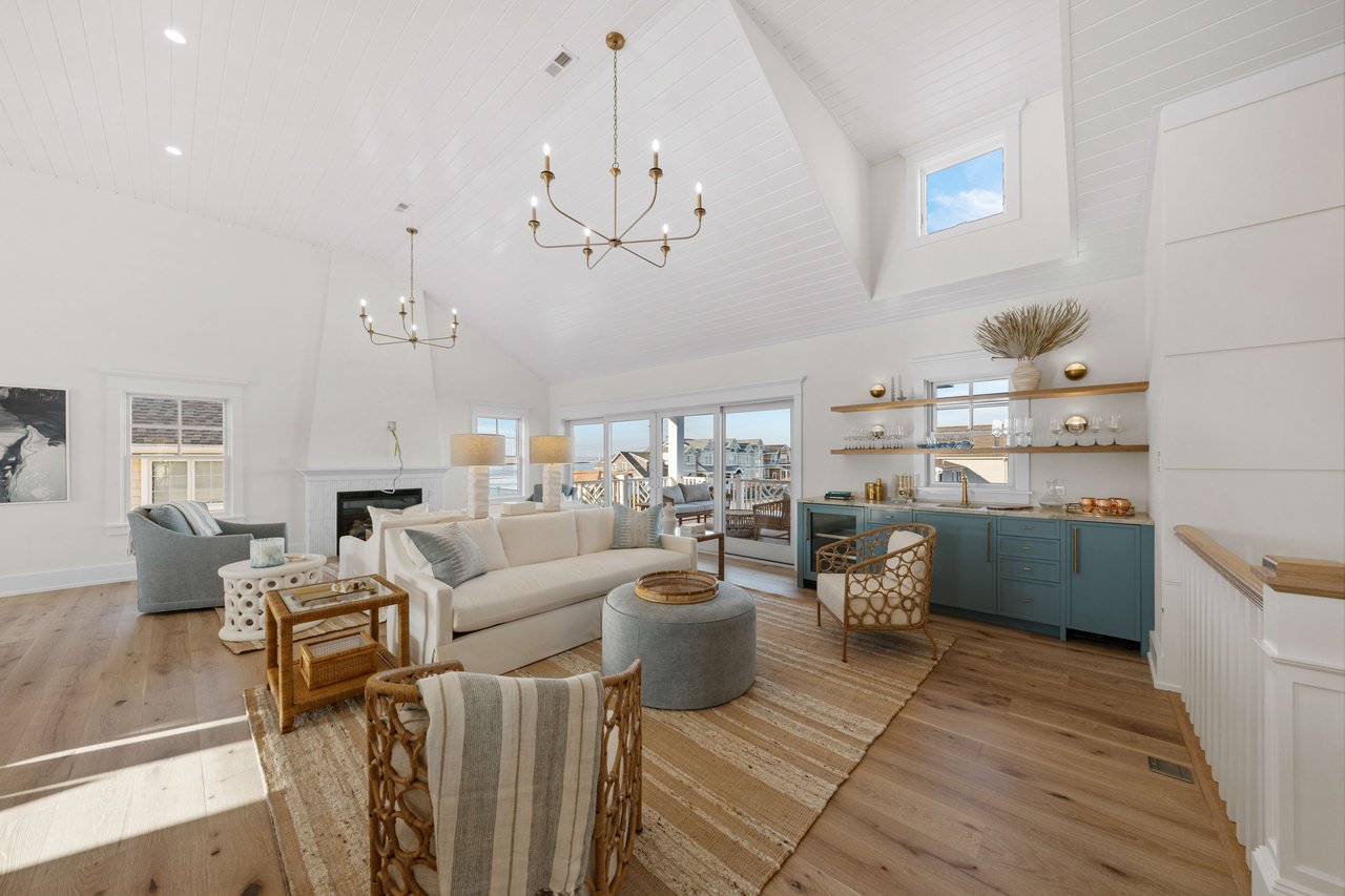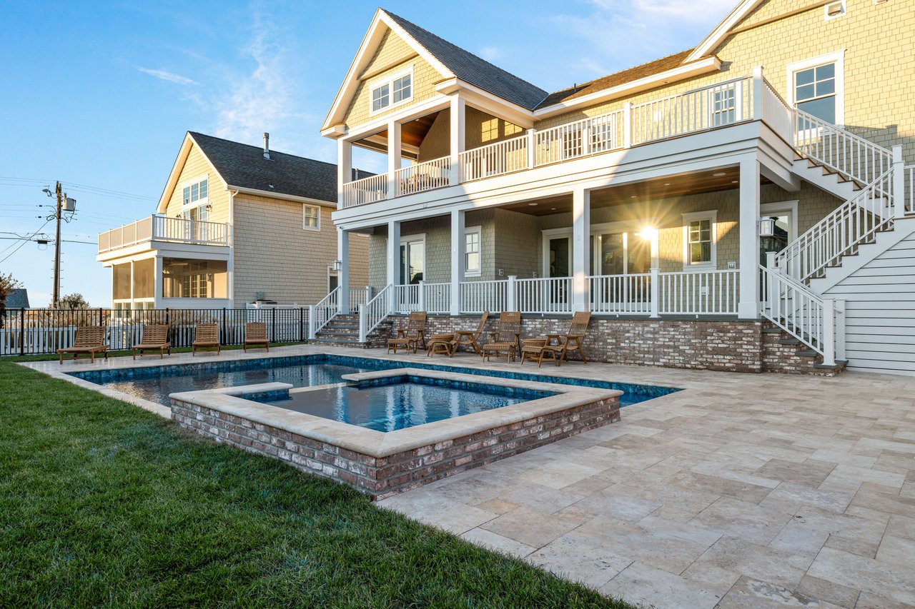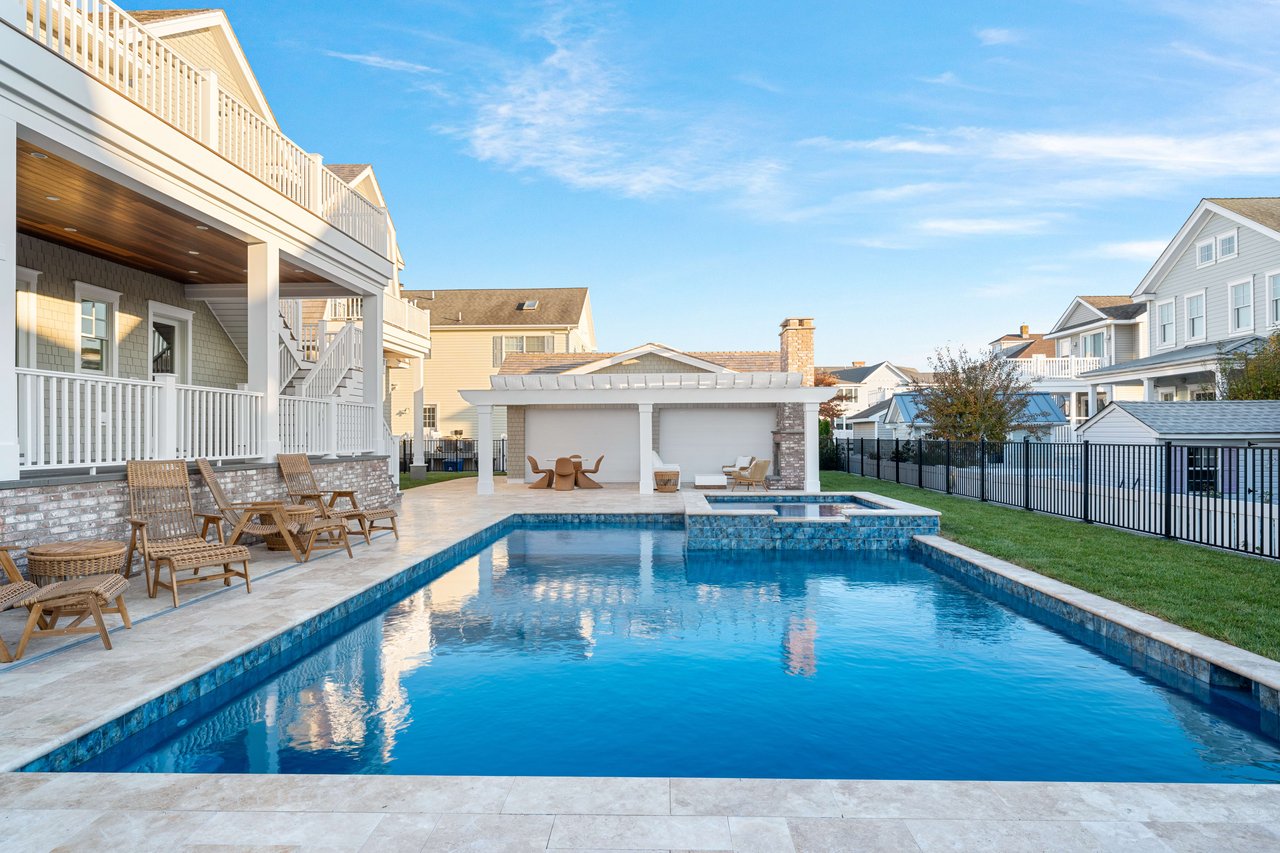 Impressively imagined and conceived for entertaining, this admirable estate is ready to host family, friends, and large gatherings like no other property on the island. Refined and classic, this gorgeous home will offer over 5,000 sq. ft of living space, 8 bedrooms, 8 full baths, 2 powder rooms, 5 porches, 1.5 car garage plus a 900+/- sq ft pool house. Thoughtfully designed by Architect Blaine Steinman and masterfully constructed by Vallese Builders, this home is divided into separate living spaces that multiple generations can enjoy while still offering an open concept design. Entering through the covered porch you are greeted with a 200-bottle wine cellar exquisitely built-in under the staircase, as you continue forward you will enter the cozy family room that leads to the rear covered porch. There are 5 ensuite bedrooms on the first floor with one offering custom built-in bunks. A powder room that can be accessed from the deck and an expansive laundry room round out this level. Ready for everyday living, the second level leads to an open concept kitchen, dining, and living area with dramatic vaulted ceilings. The kitchen consists of custom cabinetry and an oversized island with seating for six and top of the line appliances for the home chef, as well as a full walk-in pantry. Just off of the kitchen is a dining area for ten and an additional dining space overlooking the pool on the rear porch. The living space features a gas fireplace and wet bar as it leads out to the covered front porch offering incredible bay and sunset views to the west. There are two additional ensuite bedrooms, one of which is another custom bunk room. Lastly you have the master suite that has its own entire wing on the east side of the home. A pocket door opens leading into a bright and airy home office. As you continue into the master you will be blown away by its size and soaring vaulted ceilings. There is a his and hers walk-in closet as well as a spacious master bath that offers his and her vanities, a soaking tub and stunning tiled walk in-shower. The highlight of the home is without a doubt the resort like entertaining space that fills the backyard of this incredible 105'x110' lot. There is a pool house like no other that has ever been seen on 7 Mile Island. The pool house consists of an outdoor kitchen, bar, dining area and lounge area in front of a stunning fireplace. Steps away is the large, heated swimming pool with a spillover spa. There is ample space for lounge chairs as well as a beautifully landscaped side yard. This is a true entertainer's paradise. The home is located on a beautiful street just steps away from the Stone Harbor Yacht Club and a short stroll to downtown shopping and dining. If you are looking for a legacy estate to house multiple generations this is a must-see property. The home will be professionally and tastefully furnished by BluFish Interiors and the estimated completion is November 2023.