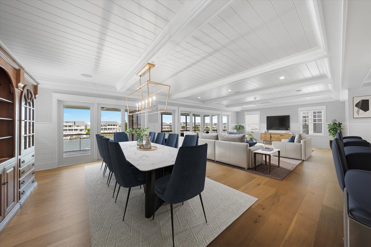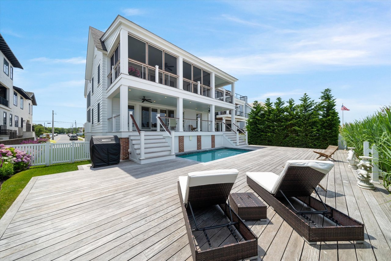Welcome to 4808 Ocean Drive, nestled in the prestigious fingers of Avalon. Built in 2020 by Winfield developers and designed by Asher Architects, this coastal retreat spans over 6,300 square feet, offering 7 bedrooms, 6.2 baths, and unlimited bayfront views. Meticulously maintained, the ground level provides easy access via four stop elevators. For beachgoers, a dual shower conveniently connects to the main entryway. With a 2-car garage and 6 driveway parking spaces, ample parking is available for all your guests. Upon entering, you'll be greeted by shiplap ceilings and a grand staircase. The first level features a family room with a large bar, complete with refrigerator drawers, custom cabinetry, and a dishwasher. Additionally, this floor includes a spacious laundry room and powder room that opens to the enlarged covered deck, offering serene views of the reeds and bay. Outside, the home boasts ipe decking and a 10’x21’ pool, with the deck extending over the new bulkhead to a large deck space perfect for al fresco dining with bayfront vistas. The property also accommodates two boat slips with direct access to the main channel, and hosts 3 ensuite bedrooms, including a built-in bunk room capable of sleeping up to 5, complete with a connecting dual vanity and bathtub. Moving to the second floor, the main living area features a generous dining space, living room, and a chef's kitchen equipped with Thermador appliances and custom cabinetry. The kitchen island overlooks the waterfront views and extends to covered porches, one of which features a large, fixed screen to shield from insects. This level also includes a fourth ensuite bedroom and a junior master suite with double vanities, a private porch, and two custom closets. Venture to the third level to discover the primary suite, which encompasses an office room, workout room, or 7th bedroom, along with a laundry room, a large walk-in closet, and a grand primary bathroom featuring a seamless walk-in shower, private toilet room, and a primary suite with surrounding sunset views and a private deck. This nearly new home is turnkey and awaiting your personal touch. Schedule an appointment now to envision the possibilities and make this coastal haven your own!